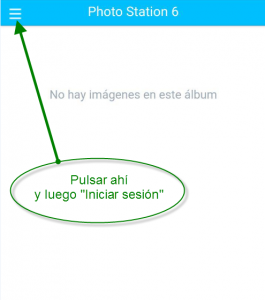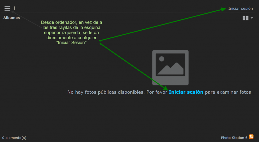 INSTRUCCIONES: Al entrar, redireccionará al "PhotoStation" de nuestro servidor NAS, y veréis una pantalla casi vacía. Desde móvil tenéis quedarle a las tres rayitas de la esquina y luego a "Iniciar sesión".
